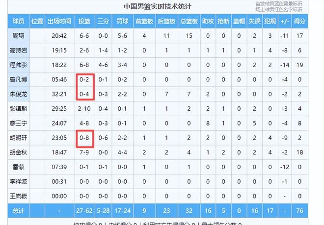还有雷打不动的国手,历届主教练都喜欢用的朱俊龙,两场都拉胯,不是说你防守端牛逼吗?可是两场也防不住人,不但防守不行,进攻也不行,大空位三分居然投出三不沾,被解说嘉宾陈正昊嘲笑,全场打了最多的32分钟,4投0中,他和胡明轩一样也是靠罚球得了2分,两战怒砍4分。