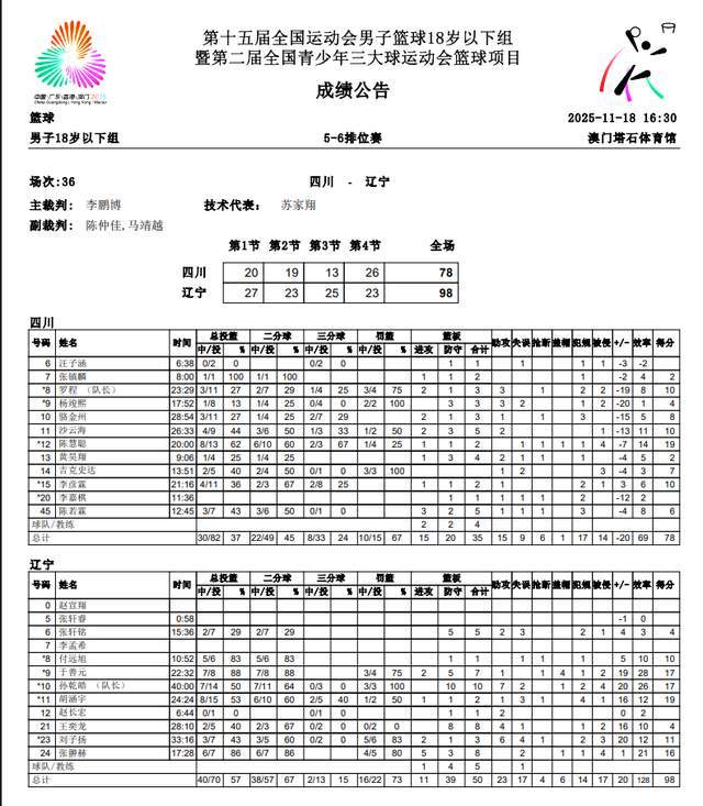 如此大比分领先,到了第四节就没有啥悬念了。即便四川队打出26-23,追回3分,可惜也是枉然。最终,辽宁U18男篮以98-78大胜四川队,拿到了本届全运会的第五名,恭喜辽宁男篮,恭喜吴庆龙!